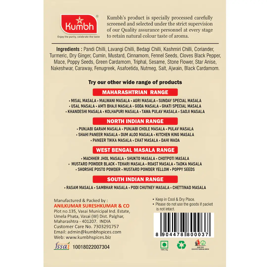 Kumbh Agri Masala is made by roasting all the ingredients at an appropriate temperature to enhance the flavours of the spice to the maximum. Then the spices are blended in an appropriate proportion to give it a perfect taste.