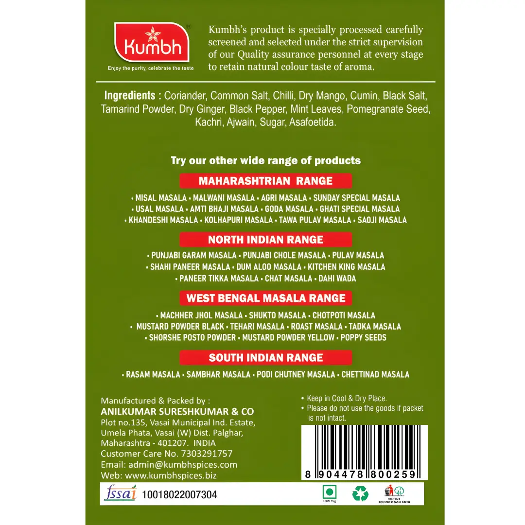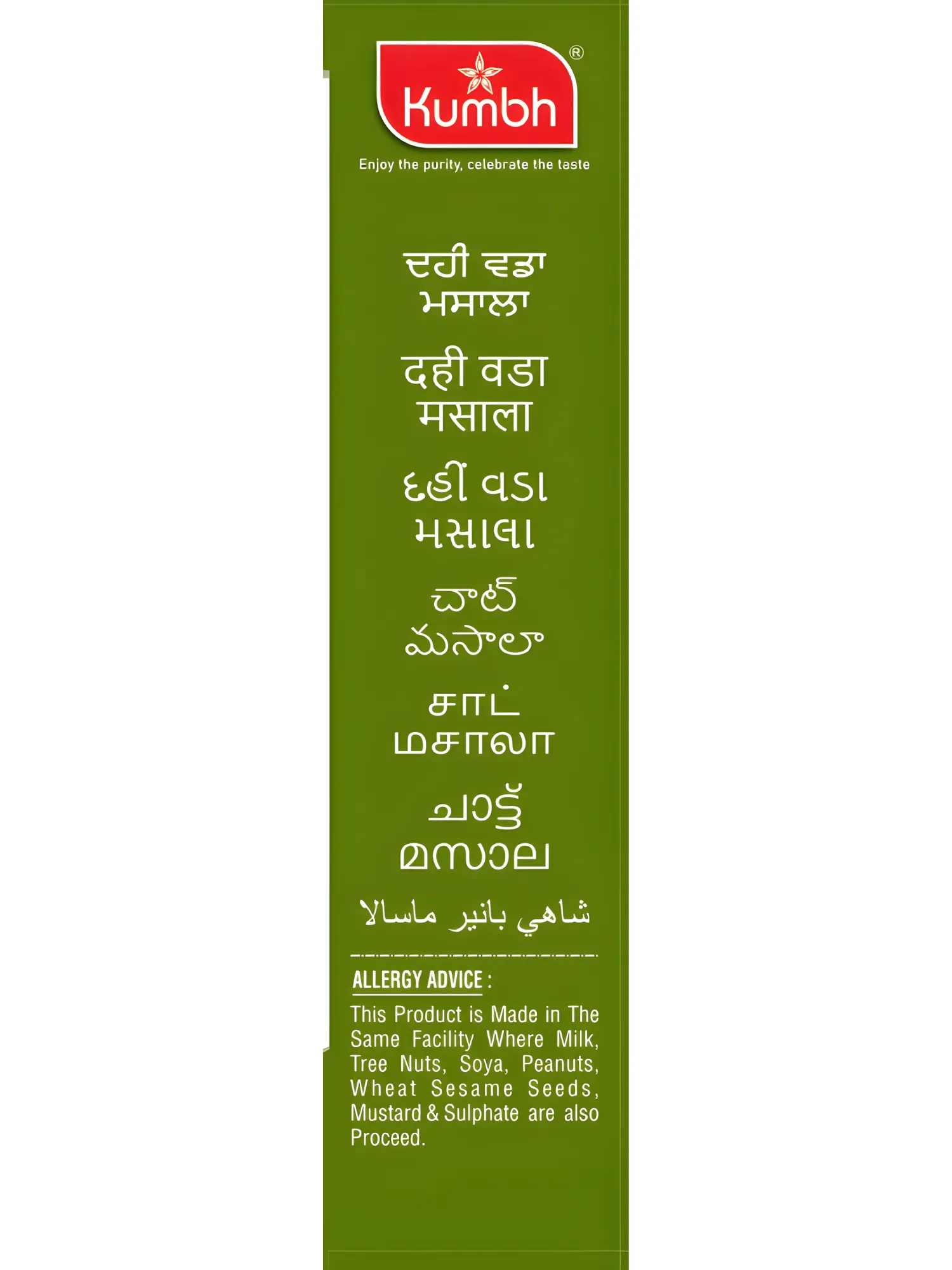 Kumbh Dahiwada Masala is a blend of spices used to prepare the popular Indian yogurt-based dish called Dahiwada. This spice mix is made with high-quality ingredients, including cumin, coriander, mint, and other spices, and is specifically designed to enhance the flavor of Dahiwada. It adds a tangy, spicy and aromatic taste to the dish, making it a popular side dish or snack option. Dahiwada is a dish made with deep-fried lentil dumplings served with yogurt, while Raita is a condiment made with yogurt, vegetables, and spices, and it is perfect for those who enjoy the flavorful and refreshing taste of Indian yogurt-based dishes.