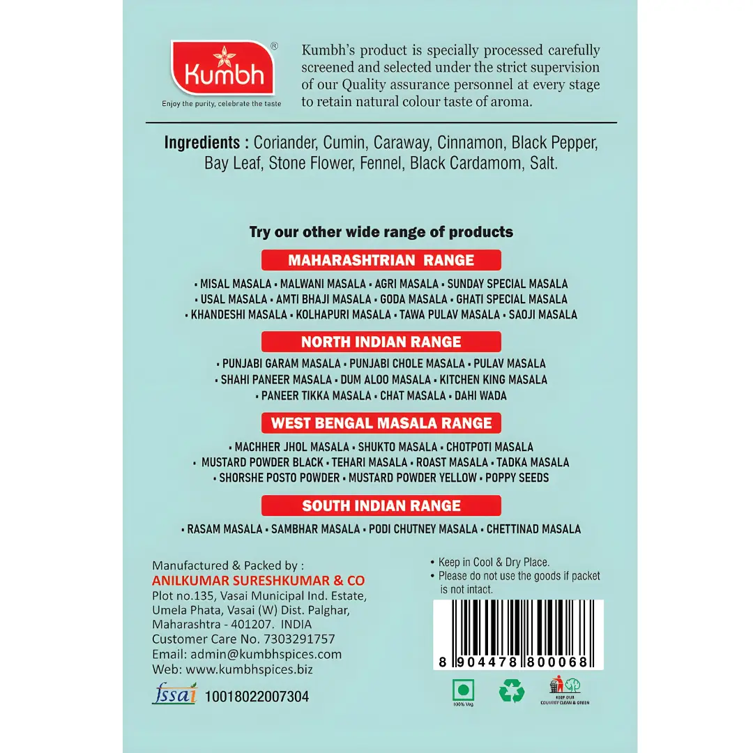 Kumbh Ghati Masala Powder is made with carefully selected 10 aromatic and quality spices. Use it to make a hot and spicy recipes. It is a versatile spice blend which can be used to make Aloo Bonda, Samosa to Chickpea (Chana/Chole) Curry to non-vegeterian gravy roasts.You may be required to use very little quantity of this masala in your food preparations. This is mainly used in Maharashtrian/Marathi Foods
