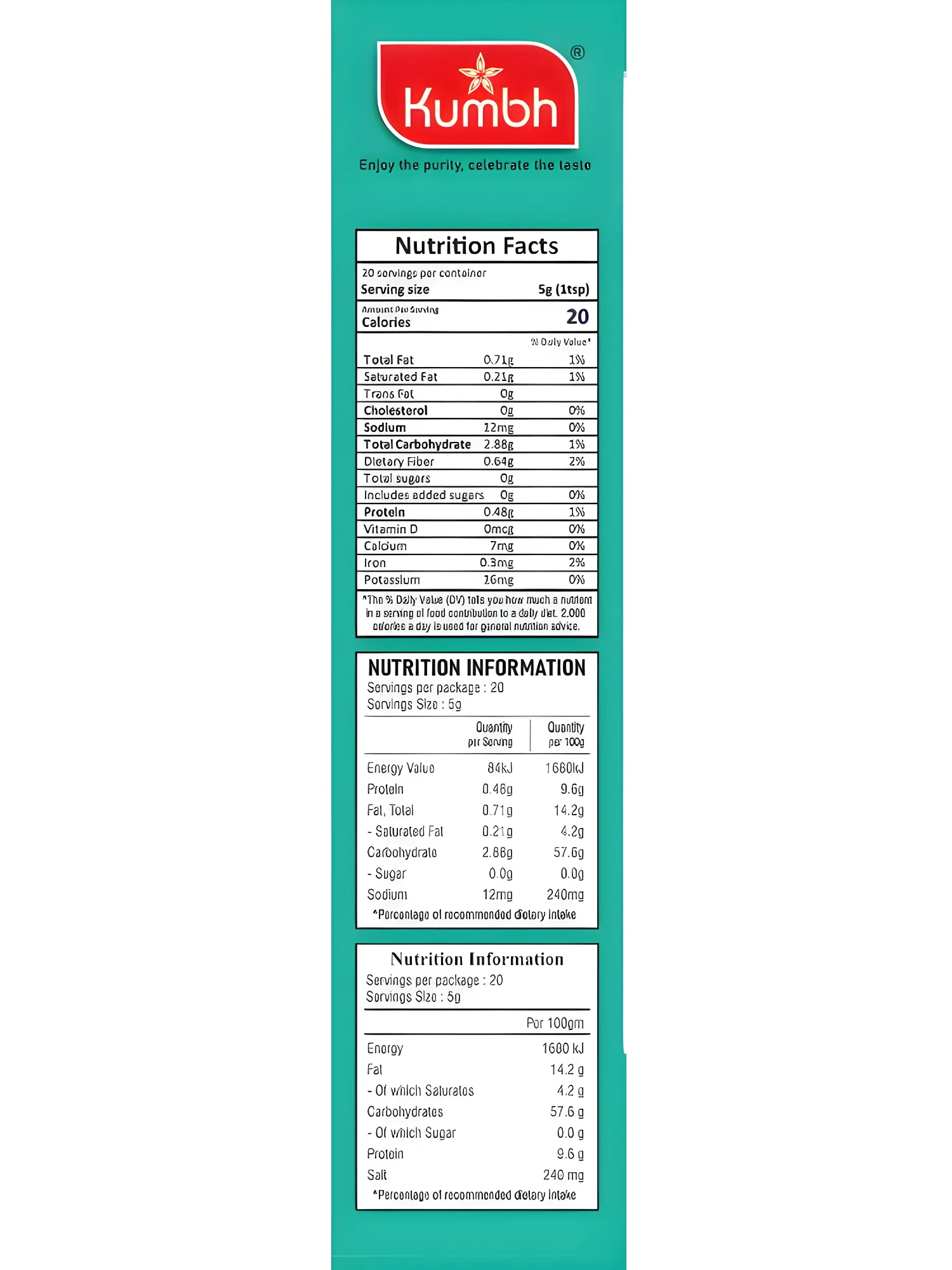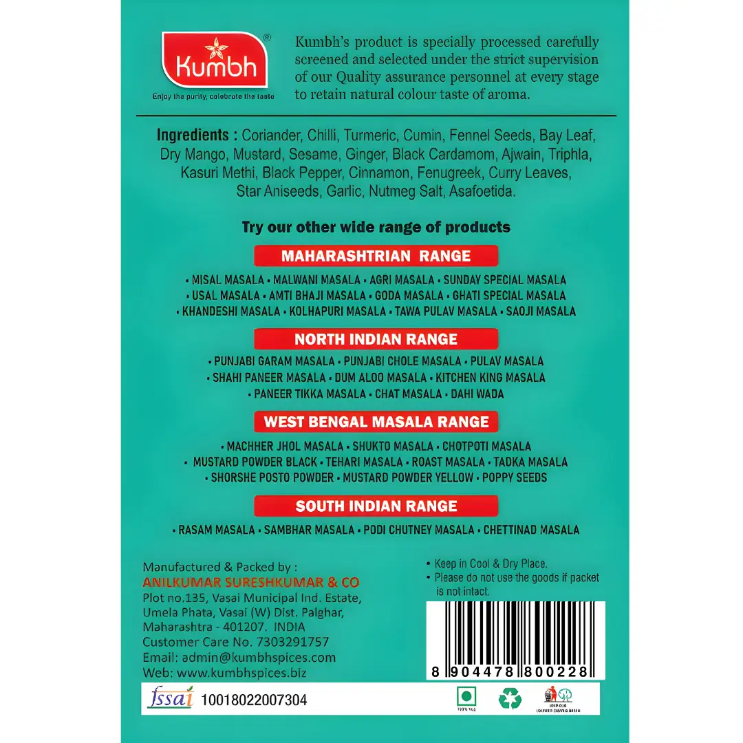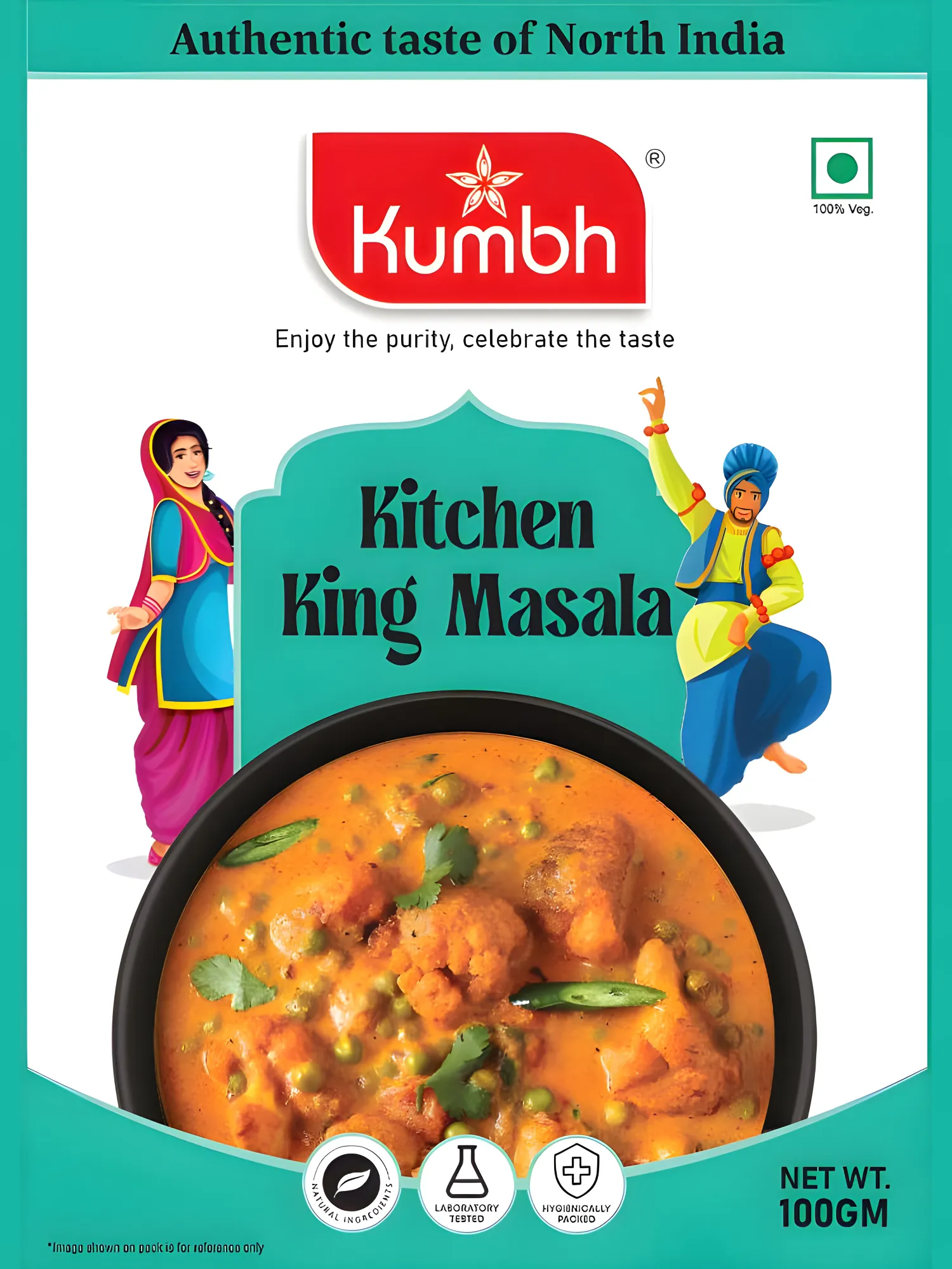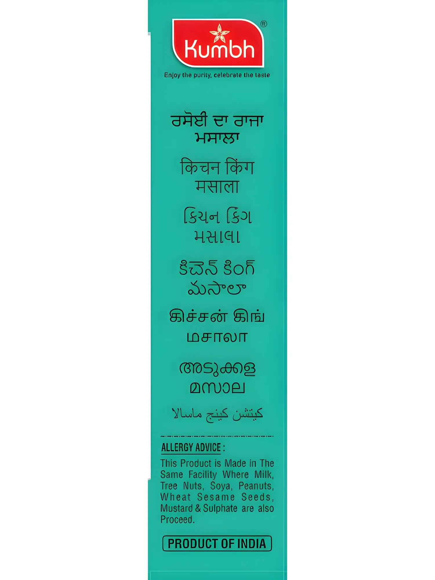 Kumbh Kitchen King Masala is a perfect blend of aromatic spices giving more texture and taste to a variety of curry based dishes. With No added preservatives and artificial colurs, the masala is 100% natural and pure. Make your food more appealing and palatable with Kumbh Kitchen King Masala. (BEST USE IS TO SPRINKLER AT THE END OF PREPARATION OF DISH GIVES TASTE ENCHANCEMENT)