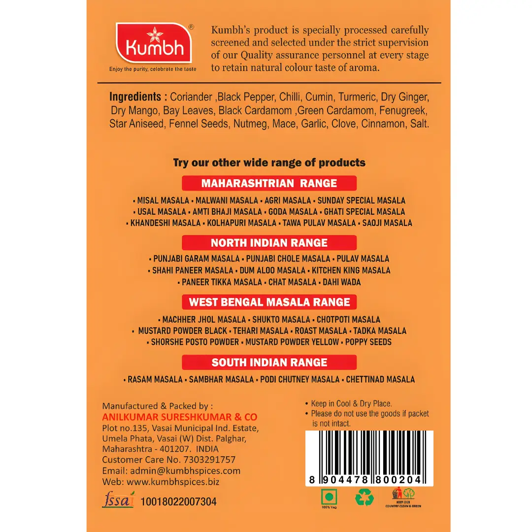 Kumbh Shahi Paneer Masala is a blended spice mix made from carefully handpicked, high-quality whole spices sourced from the best of origins. The formulation has been specially crafted by renowned Masters, who ensures that you get the right spices, in the right proportion. Kumbh Shahi Paneer Masala have their essential natural oils intact making food nutritious and healthy.